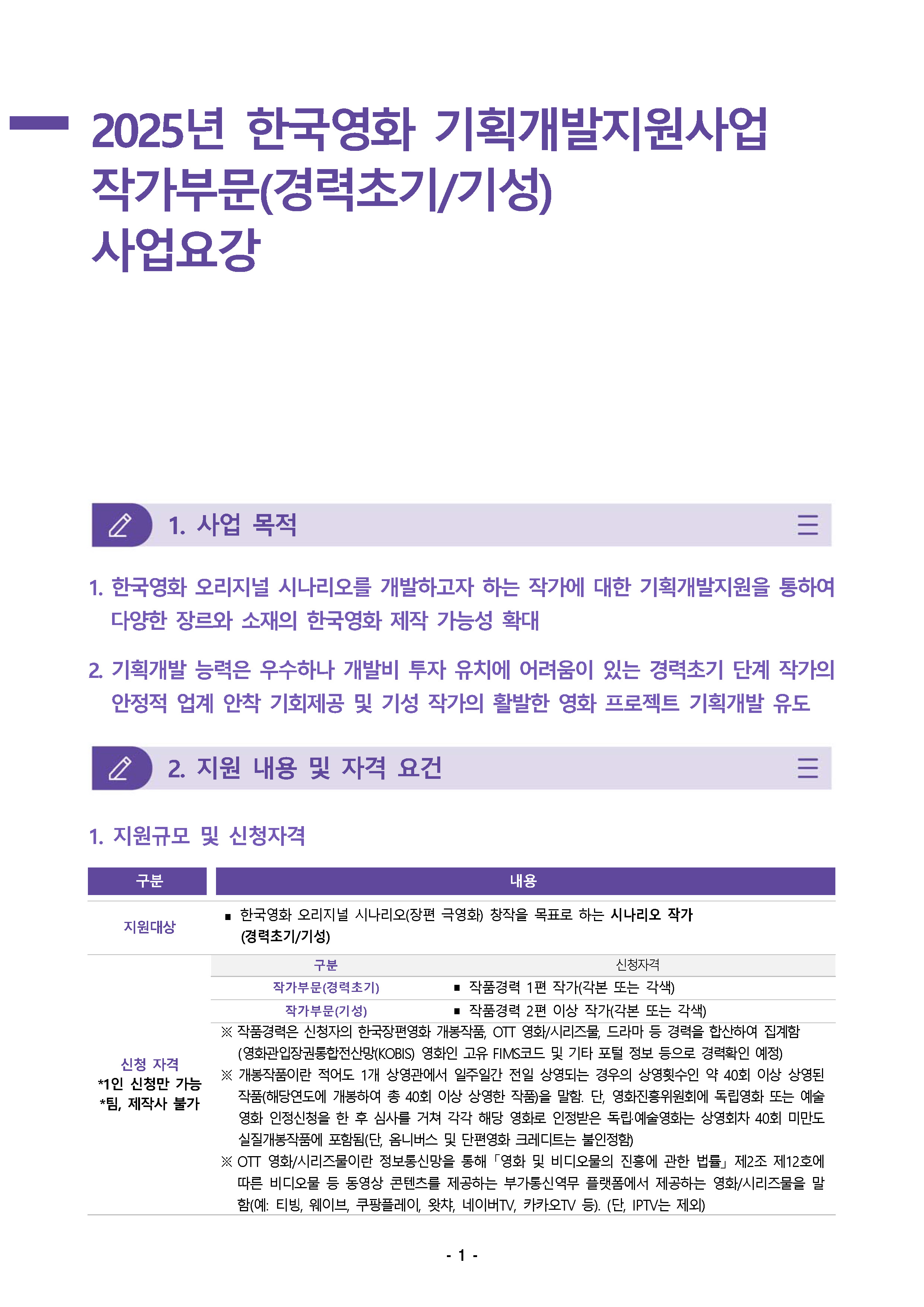2025년 한국영화 기획개발지원사업 작가부문(경력초기/기성) 사업공고